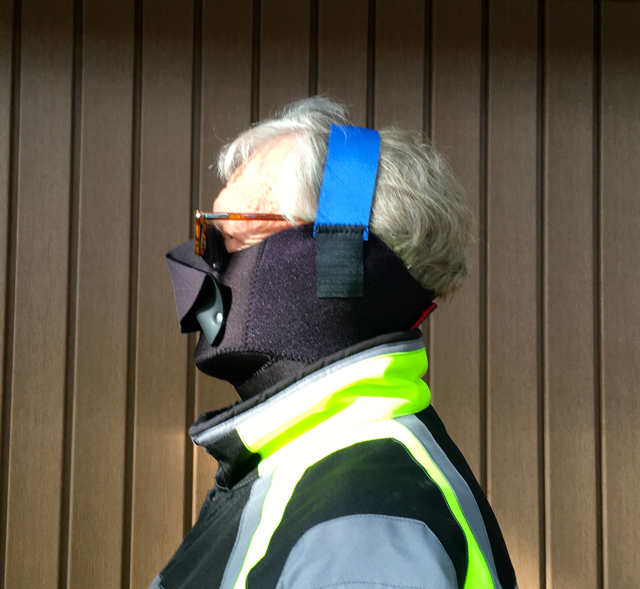My No Fog Mask fits easily under my helmet. It fastens with Velcro at the back and by a strap that goes over my head (some models have adjustable straps). Then, my jaw squarely ensconces itself in the comfortable No Fog chin cup. And the whole apparatus stays put until I remove it, regardless of how I may turn my head while riding.